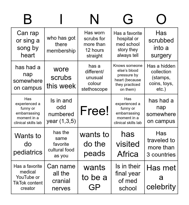 This bingo card has a free space and 59 words: Knows how to suture, Can name all the cranial nerves, Pulled an all-nighter before exams, Wants to do pediatrics, Is in their final year of med school, Knows their blood type, wore scrubs this week, Speaks more than 2 languages, Knows someone else’s blood pressure by heart (because they practiced on them), Knows what specialty they don’t want to do, Has a favorite hospital or med school story they always tell, Has a secret talent, has had a nap somewhere on campus, Has met a celebrity, Knows a random useless fact, Can rap or sing a song by heart, Has met a celebrity, Has scrubbed into a surgery, Has ever fainted or almost fainted in a lab or clinic, has a different/ unusual colour stethoscope, Has experienced a funny or embarrassing moment in a clinical skills lab, Has worn scrubs for more than 12 hours straight, Has a favorite medical YouTube or TikTok content creator, Has traveled to more than 3 countries, Has a pet (or pets!), Has tried a weird food combination, Has a funny nickname, Loves to cook or bake, Has a hidden collection (stamps, coins, toys, etc.), plays a sport or sports, has never tired Jollof rice, Is from Nigeria, Is from the Caribbean, who has been on committee more than once, who has got there membership, who has a funny/ memorable ACMS moment, Is from Ghana, Is in and odd numbered year (1,3,5), find someone in a different year to you, Has experienced a funny or embarrassing moment in a clinical skills lab, has a secret talent, has the same favorite cultural food as you, has had a nap somewhere on campus, who eats a weird combination of food, has a favourite hospital or med school story they tell, speaks more than 2 language, knows how to suture, can name all the cranial nerves, wants to do the peads, wants to be a GP, wants to be surgen, has watched an interesting surgery, knows your blood type, has traveled to more them 3 countries, speaks an Afro/Caribbean language, has visited Africa, Has visited the Caribbean, knows a traditional cultural dance African or Caribbean and can name at least 3 Caribbean island.