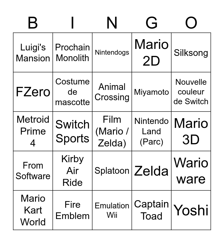This bingo card has a free space and 24 words: Kirby Air Ride, Fire Emblem, Animal Crossing, Mario Kart World, Silksong, Luigi's Mansion, FZero, Prochain Monolith, Nintendo Land (Parc), Splatoon, Miyamoto, Metroid Prime 4, Zelda, Wario ware, Costume de mascotte, Captain Toad, Mario 3D, Nintendogs, Nouvelle couleur de Switch, Switch Sports, Yoshi, From Software, Mario 2D and Emulation Wii.