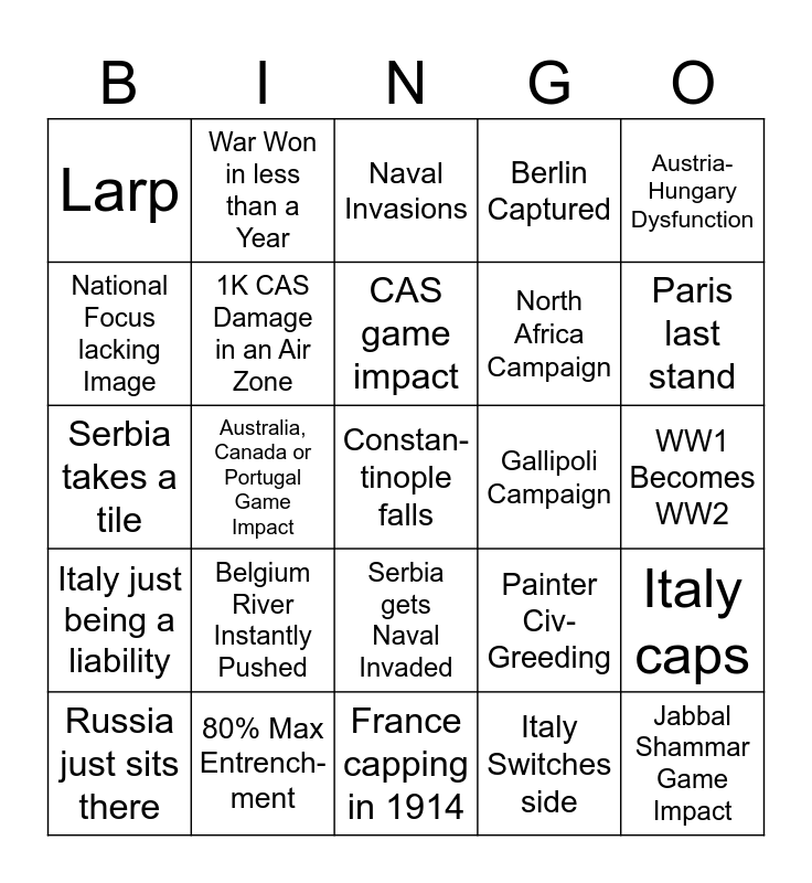 This bingo card has 25 words: Belgium River Instantly Pushed, France capping in 1914, CAS game impact, Russia just sits there, Austria-Hungary Dysfunction, Larp, National Focus lacking Image, War Won in less than a Year, Gallipoli Campaign, Serbia gets Naval Invaded, North Africa Campaign, Serbia takes a tile, Painter Civ-Greeding, Italy caps, 1K CAS Damage in an Air Zone, Jabbal Shammar Game Impact, WW1 Becomes WW2, Naval Invasions, Paris last stand, Australia, Canada or Portugal Game Impact, Constan- tinople falls, 80% Max Entrench-ment, Italy just being a liability, Berlin Captured and Italy Switches side.