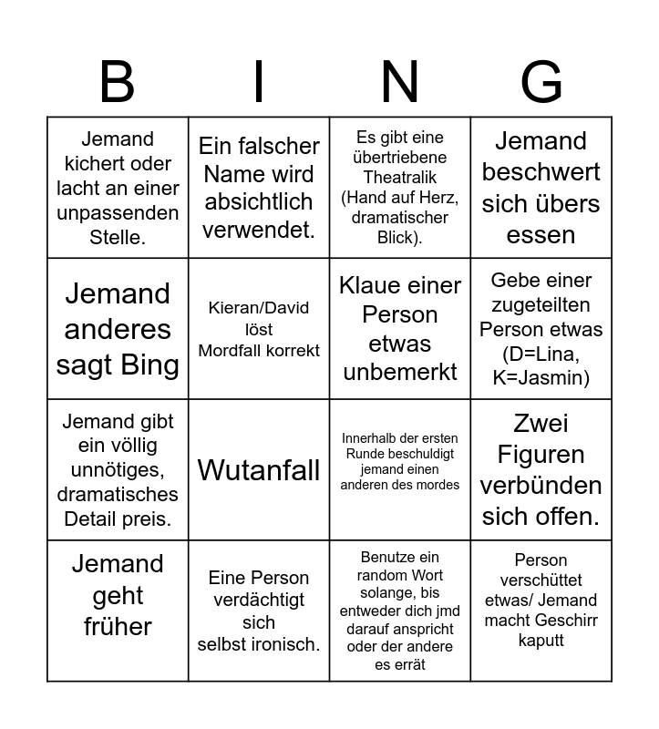 This bingo card has 16 words: Eine Person verdächtigt sich selbst ironisch., Zwei Figuren verbünden sich offen., Es gibt eine übertriebene Theatralik (Hand auf Herz, dramatischer Blick)., Jemand kichert oder lacht an einer unpassenden Stelle., Jemand gibt ein völlig unnötiges, dramatisches Detail preis., Ein falscher Name wird absichtlich verwendet., Innerhalb der ersten Runde beschuldigt jemand einen anderen des mordes, Benutze ein random Wort solange, bis entweder dich jmd darauf anspricht oder der andere es errät, Jemand anderes sagt Bing, Kieran/David löst Mordfall korrekt, Jemand geht früher, Jemand beschwert sich übers essen, Wutanfall, Gebe einer zugeteilten Person etwas (D=Lina, K=Jasmin), Klaue einer Person etwas unbemerkt and Person verschüttet etwas/ Jemand macht Geschirr kaputt.