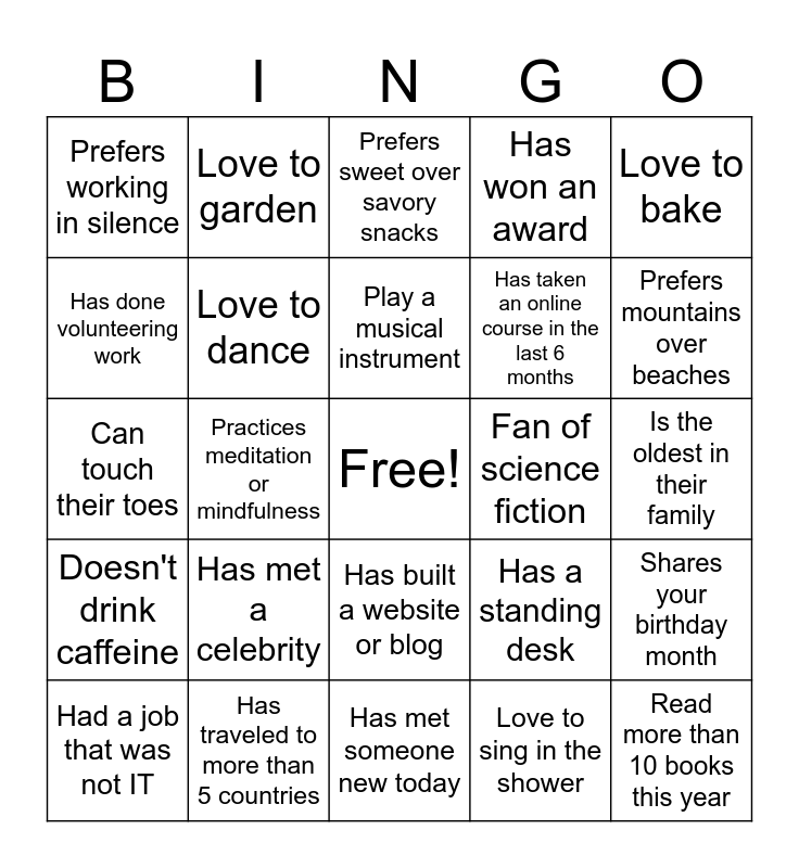 This bingo card has a free space and 24 words: Has met a celebrity, Has traveled to more than 5 countries, Play a musical instrument, Had a job that was not IT, Love to bake, Prefers working in silence, Has done volunteering work, Love to garden, Fan of science fiction, Has built a website or blog, Has taken an online course in the last 6 months, Can touch their toes, Has a standing desk, Shares your birthday month, Love to dance, Love to sing in the shower, Is the oldest in their family, Prefers sweet over savory snacks, Prefers mountains over beaches, Practices meditation or mindfulness, Read more than 10 books this year, Doesn't drink caffeine, Has won an award and Has met someone new today.