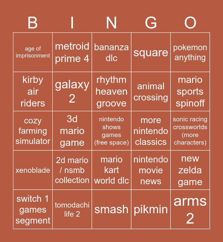 This bingo card has a free space and 24 words: 2d mario / nsmb collection, tomodachi life 2, rhythm heaven groove, switch 1 games segment, pokemon anything, age of imprisonment, kirby air riders, metroid prime 4, more nintendo classics, mario kart world dlc, animal crossing, cozy farming simulator, nintendo movie news, new zelda game, galaxy 2, pikmin, sonic racing crossworlds (more characters), bananza dlc, mario sports spinoff, 3d mario game, arms 2, xenoblade, square and smash.