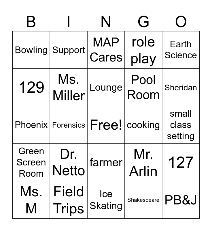 This bingo card has a free space and 24 words: Dr. Netto, Field Trips, Lounge, Ms. M, Earth Science, Bowling, 129, Support, cooking, farmer, Pool Room, Phoenix, Mr. Arlin, 127, Ms. Miller, Shakespeare, small class setting, MAP Cares, Sheridan, Forensics, PB&J, Green Screen Room, role play and Ice Skating.