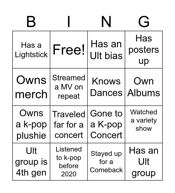 This bingo card has 19 words: Gone to a K-pop Concert, Has Photocards, Has an Ult bias, Has an Ult group, Watched a variety show, Owns merch, Stayed up for a Comeback, Has a Lightstick, Free!, Owns a k-pop plushie, Traveled far for a concert, Streamed a MV on repeat, Knows Dances, Listened to k-pop before 2020, Ult group is 4th gen, Wore a k-pop outfit, Has posters up, Own Albums and Likes girl groups more.
