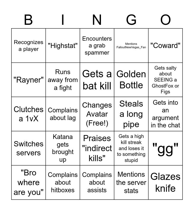 This bingo card has a free space and 24 words: Katana gets brought up, Complains about hitboxes, Gets a bat kill, "Bro where are you", "Coward", Recognizes a player, "Rayner", "Highstat", Steals a long pipe, Praises "indirect kills", Golden Bottle, Clutches a 1vX, Gets a high kill streak and loses it to something stupid, "gg", Runs away from a fight, Mentions the server stats, Gets into an argument in the chat, Encounters a grab spammer, Gets salty about SEEING a GhostFox or Figs, Complains about lag, Glazes knife, Switches servers, Mentions FalloutNewVegas_Fan and Complains about assists.