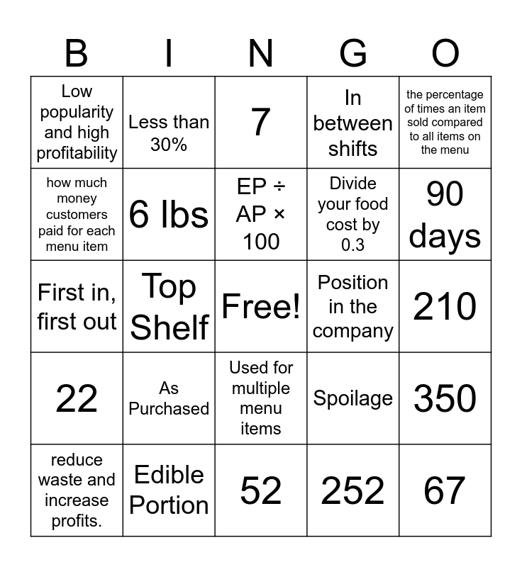 This bingo card has a free space and 24 words: As Purchased, Edible Portion, EP ÷ AP × 100, reduce waste and increase profits., the percentage of times an item sold compared to all items on the menu, Low popularity and high profitability, how much money customers paid for each menu item, Less than 30%, Position in the company, Used for multiple menu items, Divide your food cost by 0.3, First in, first out, Spoilage, 350, 6 lbs, 252, 210, 7, 90 days, Top Shelf, 67, 22, In between shifts and 52.