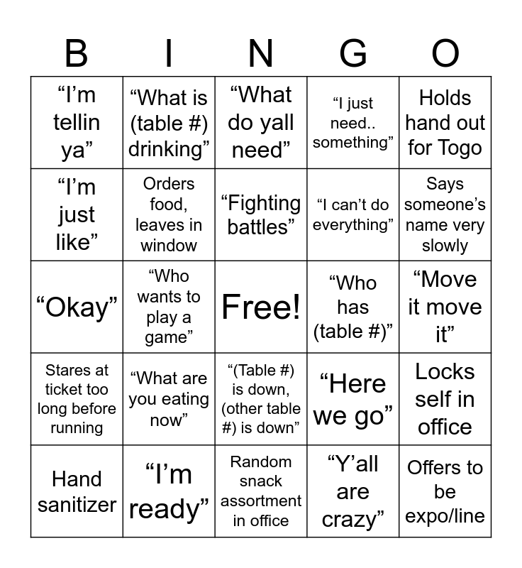 This bingo card has a free space and 24 words: “What are you eating now”, “I’m ready”, “Fighting battles”, Hand sanitizer, Holds hand out for Togo, “I’m tellin ya”, “I’m just like”, “What is (table #) drinking”, “Who has (table #)”, “(Table #) is down, (other table #) is down”, “I can’t do everything”, “Okay”, “Here we go”, Locks self in office, Orders food, leaves in window, “Y’all are crazy”, “Move it move it”, “What do yall need”, Says someone’s name very slowly, “Who wants to play a game”, Offers to be expo/line, Stares at ticket too long before running, “I just need.. something” and Random snack assortment in office.