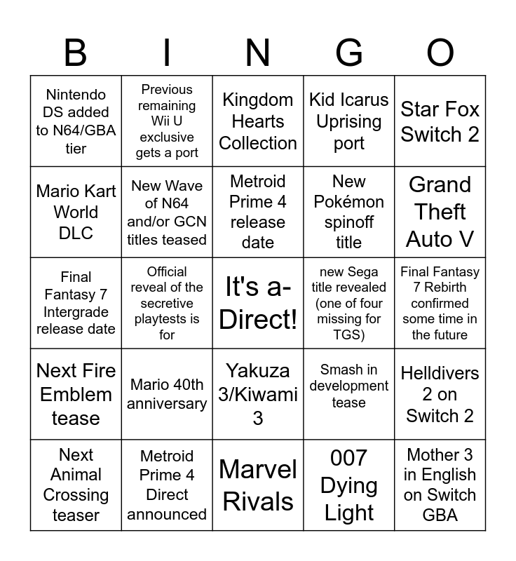 This bingo card has a free space and 24 words: Mario 40th anniversary, Metroid Prime 4 Direct announced, Metroid Prime 4 release date, Next Animal Crossing teaser, Star Fox Switch 2, Nintendo DS added to N64/GBA tier, Mario Kart World DLC, Previous remaining Wii U exclusive gets a port, new Sega title revealed (one of four missing for TGS), Yakuza 3/Kiwami 3, New Pokémon spinoff title, Final Fantasy 7 Intergrade release date, Smash in development tease, Helldivers 2 on Switch 2, New Wave of N64 and/or GCN titles teased, 007 Dying Light, Final Fantasy 7 Rebirth confirmed some time in the future, Kingdom Hearts Collection, Grand Theft Auto V, Official reveal of the secretive playtests is for, Mother 3 in English on Switch GBA, Next Fire Emblem tease, Kid Icarus Uprising port and Marvel Rivals.
