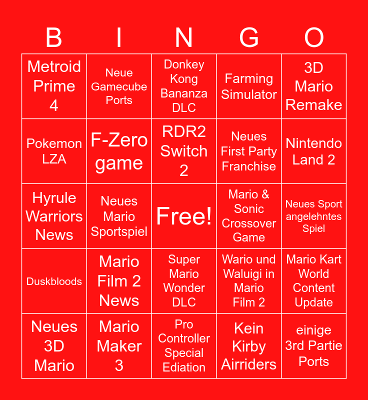 This bingo card has a free space and 24 words: Mario Film 2 News, Mario Maker 3, RDR2 Switch 2, Neues 3D Mario, 3D Mario Remake, Metroid Prime 4, Pokemon LZA, Neue Gamecube Ports, Mario & Sonic Crossover Game, Super Mario Wonder DLC, Neues First Party Franchise, Hyrule Warriors News, Wario und Waluigi in Mario Film 2, Mario Kart World Content Update, F-Zero game, Kein Kirby Airriders, Neues Sport angelehntes Spiel, Donkey Kong Bananza DLC, Nintendo Land 2, Neues Mario Sportspiel, einige 3rd Partie Ports, Duskbloods, Farming Simulator and Pro Controller Special Ediation.