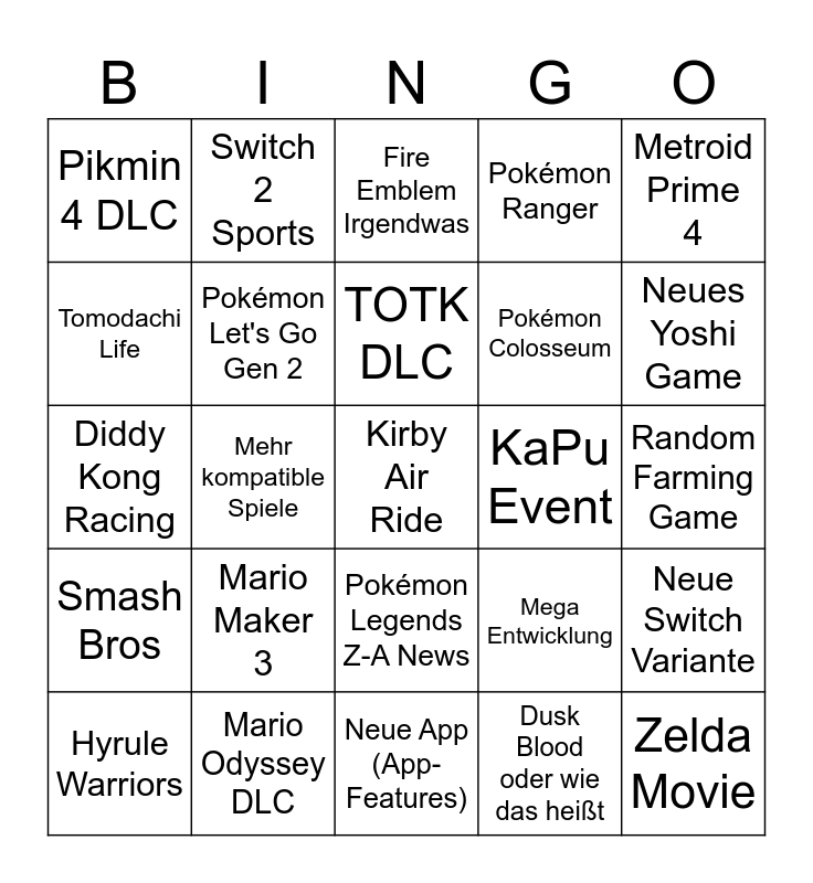 This bingo card has a free space and 24 words: Mario Maker 3, Mario Odyssey DLC, TOTK DLC, Hyrule Warriors, Metroid Prime 4, Pikmin 4 DLC, Tomodachi Life, Switch 2 Sports, KaPu Event, Pokémon Legends Z-A News, Pokémon Colosseum, Diddy Kong Racing, Mega Entwicklung, Neue Switch Variante, Pokémon Let's Go Gen 2, Dusk Blood oder wie das heißt, Random Farming Game, Fire Emblem Irgendwas, Neues Yoshi Game, Mehr kompatible Spiele, Zelda Movie, Smash Bros, Pokémon Ranger and Neue App (App-Features).