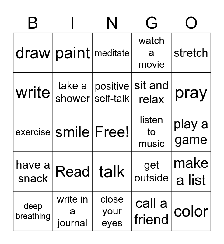 This bingo card has a free space and 24 words: Read, write in a journal, positive self-talk, deep breathing, stretch, draw, write, paint, listen to music, talk, sit and relax, exercise, get outside, make a list, take a shower, call a friend, play a game, meditate, pray, smile, color, have a snack, watch a movie and close your eyes.