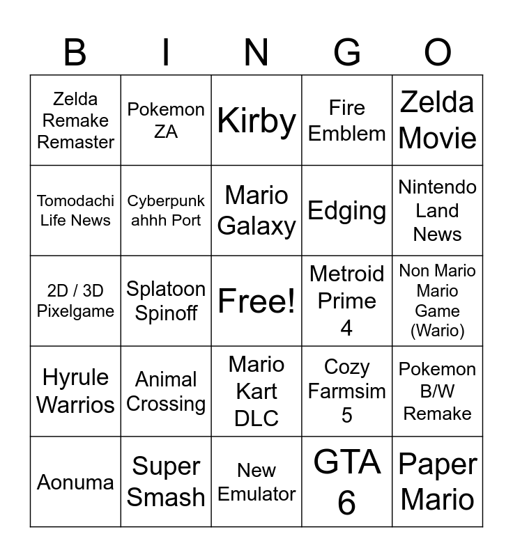 This bingo card has a free space and 24 words: Animal Crossing, Super Smash, Mario Galaxy, Aonuma, Zelda Movie, Zelda Remake Remaster, Tomodachi Life News, Pokemon ZA, Metroid Prime 4, Mario Kart DLC, Edging, 2D / 3D Pixelgame, Cozy Farmsim 5, Pokemon B/W Remake, Cyberpunk ahhh Port, GTA 6, Non Mario Mario Game (Wario), Kirby, Nintendo Land News, Splatoon Spinoff, Paper Mario, Hyrule Warrios, Fire Emblem and New Emulator.