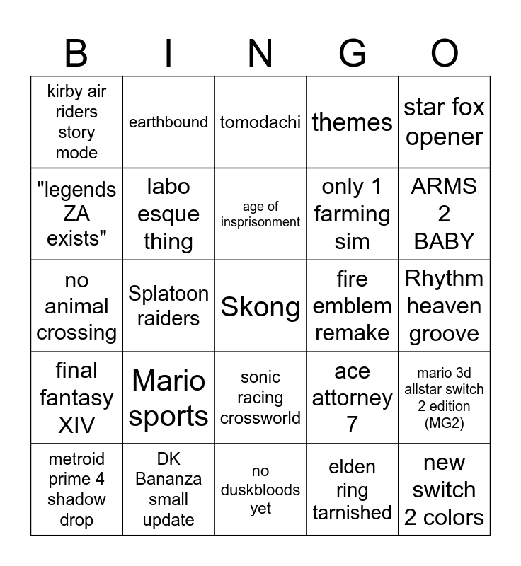 This bingo card has a free space and 24 words: Mario sports, DK Bananza small update, age of insprisonment, metroid prime 4 shadow drop, star fox opener, kirby air riders story mode, "legends ZA exists", earthbound, fire emblem remake, sonic racing crossworld, only 1 farming sim, no animal crossing, ace attorney 7, mario 3d allstar switch 2 edition (MG2), labo esque thing, elden ring tarnished, Rhythm heaven groove, tomodachi, ARMS 2 BABY, Splatoon raiders, new switch 2 colors, final fantasy XIV, themes and no duskbloods yet.