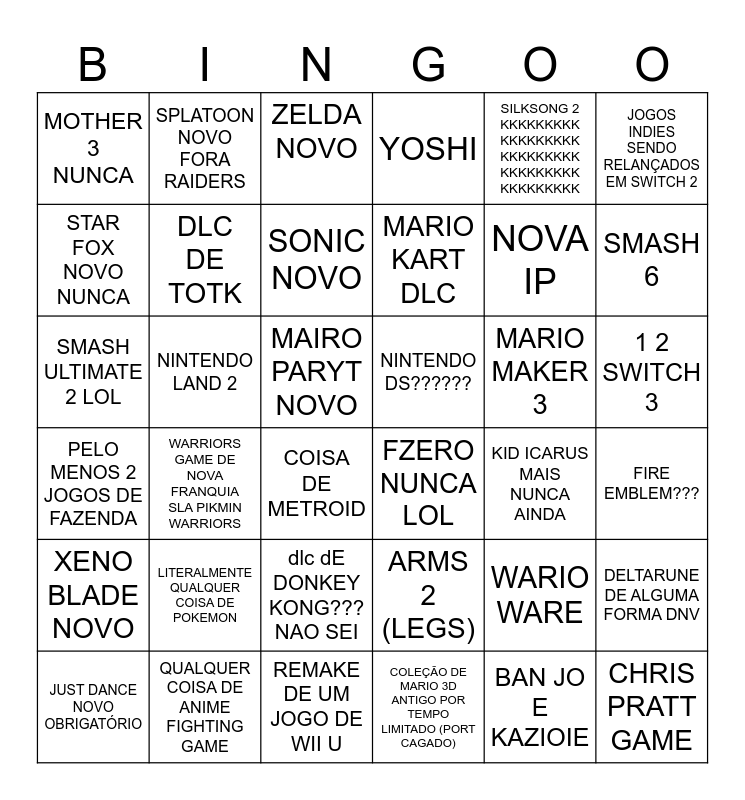 This bingo card has 42 words: BAN JO E KAZIOIE, DLC DE TOTK, TOMODACHI LIFE COISAS, MARIO MAKER 3, FIRE EMBLEM???, WARRIORS GAME DE NOVA FRANQUIA SLA PIKMIN WARRIORS, SMASH ULTIMATE 2 LOL, PIKMIN 5, ZELDA NOVO, 1 2 SWITCH 3, MAIRO PARYT NOVO, MARIO KART DLC, SMASH 6, SILKSONG 2 KKKKKKKKK KKKKKKKKK KKKKKKKKK KKKKKKKKK KKKKKKKKK, QUALQUER COISA DE ANIME FIGHTING GAME, PELO MENOS 2 JOGOS DE FAZENDA, DELTARUNE DE ALGUMA FORMA DNV, NOVA IP, CHRIS PRATT GAME, SPLATOON NOVO FORA RAIDERS, JOGOS INDIES SENDO RELANÇADOS EM SWITCH 2, dlc dE DONKEY KONG??? NAO SEI, XENO BLADE NOVO, MOTHER 3 NUNCA, ALGUM JOGO DA MICROSOFT OU SONY, JUST DANCE NOVO OBRIGATÓRIO, SONIC NOVO, ANIMAL CROSSING?, LITERALMENTE QUALQUER COISA DE POKEMON, WARIO WARE, MELEE NO GAMECUBE ONLINE ETC, NINTENDO DS??????, STAR FOX NOVO NUNCA, KID ICARUS MAIS NUNCA AINDA, REMAKE DE UM JOGO DE WII U, COISA DE METROID, FZERO NUNCA LOL, NINTENDO LAND 2, ARMS 2 (LEGS), COLEÇÃO DE MARIO 3D ANTIGO POR TEMPO LIMITADO (PORT CAGADO), YOSHI and ACE ATTORNEY!!!!!!.