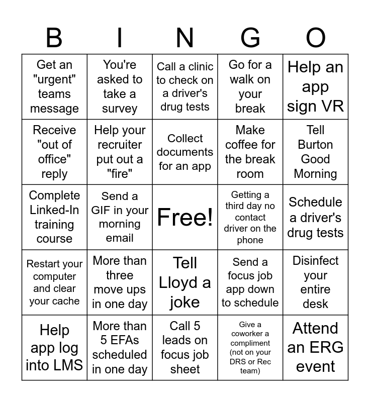 This bingo card has a free space and 24 words: More than three move ups in one day, More than 5 EFAs scheduled in one day, Collect documents for an app, Help app log into LMS, Help an app sign VR, Get an "urgent" teams message, Receive "out of office" reply, You're asked to take a survey, Getting a third day no contact driver on the phone, Tell Lloyd a joke, Make coffee for the break room, Complete Linked-In training course, Send a focus job app down to schedule, Disinfect your entire desk, Help your recruiter put out a "fire", Give a coworker a compliment (not on your DRS or Rec team), Schedule a driver's drug tests, Call a clinic to check on a driver's drug tests, Tell Burton Good Morning, Send a GIF in your morning email, Attend an ERG event, Restart your computer and clear your cache, Go for a walk on your break and Call 5 leads on focus job sheet.