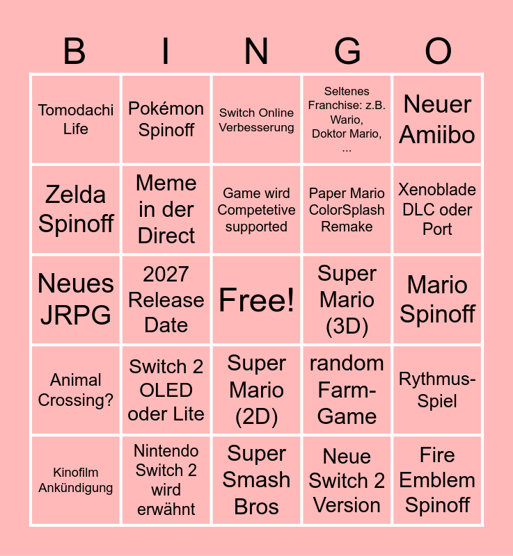 This bingo card has a free space and 24 words: Switch 2 OLED oder Lite, Nintendo Switch 2 wird erwähnt, Game wird Competetive supported, Kinofilm Ankündigung, Neuer Amiibo, Tomodachi Life, Zelda Spinoff, Pokémon Spinoff, Super Mario (3D), Super Mario (2D), Paper Mario ColorSplash Remake, Neues JRPG, random Farm-Game, Rythmus-Spiel, Meme in der Direct, Neue Switch 2 Version, Mario Spinoff, Switch Online Verbesserung, Xenoblade DLC oder Port, 2027 Release Date, Fire Emblem Spinoff, Animal Crossing?, Seltenes Franchise: z.B. Wario, Doktor Mario, ... and Super Smash Bros.