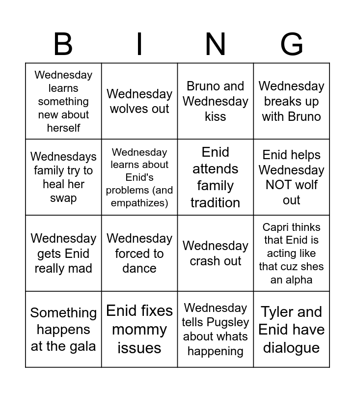 This bingo card has 16 words: Enid fixes mommy issues, Capri thinks that Enid is acting like that cuz shes an alpha, Bruno and Wednesday kiss, Wednesday learns something new about herself, Wednesday gets Enid really mad, Wednesday wolves out, Wednesday crash out, Wednesday tells Pugsley about whats happening, Wednesdays family try to heal her swap, Wednesday learns about Enid's problems (and empathizes), Something happens at the gala, Wednesday breaks up with Bruno, Wednesday forced to dance, Enid helps Wednesday NOT wolf out, Enid attends family tradition and Tyler and Enid have dialogue.