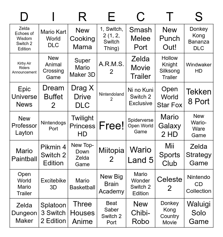 This bingo card has a free space and 48 words: Mario Wonder Switch 2 Edition, Hollow Knight Silksong Trailer, Beat Saber Switch 2 Port, Nintendogs Port, Drag X Drive DLC, New Wario-Ware Game, Mario Kart World DLC, Splatoon 3 Switch 2 Edition, New Punch Out!, Miitopia 2, Donkey Kong Bananza DLC, 1, Switch, 2 (1, 2, Switch Thing), Open World Star Fox, Ni no Kuni Switch 2 Exclusive, Open World Mario Trailer, Mario Galaxy 2 HD, Kirby Air Riders Announcement, Windwaker HD, Celeste 2, Smash Melee Port, Zelda Movie Trailer, Twilight Princess HD, Zelda Echoes of Wisdom Switch 2 Edition, New Animal Crossing Game, Nintendo CD Collection, Super Mario Maker 3D, Tekken 8 Port, Zelda Dungeon Maker, Nintendoland 2, Dream Buffet 2, Donkey Kong Country Movie, Spiderverse Open World Game, Zelda Strategy Game, Excitebike 3D, New Professor Layton, Wario Land 5, Mii Sports Club, Epic Universe News, New Top-Down Zelda Game, Mario Basketball, Mario Paintball, Waluigi Solo Game, New Cooking Mama, Three Houses Anime, A.R.M.S. 2, New Big Brain Academy, Pikmin 4 Switch 2 Edition and New Chibi-Robo.