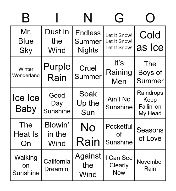 This bingo card has 35 words: Here Comes the Sun, Have You Ever Seen the Rain, Riders on the Storm, Purple Rain, No Rain, Let It Snow! Let It Snow! Let It Snow!, Winter Wonderland, Summer of ’69, Cruel Summer, Hot in Herre, Ice Ice Baby, Cold as Ice, Thunderstruck, Lightning Crashes, Mr. Blue Sky, Ain’t No Sunshine, I Can See Clearly Now, Good Day Sunshine, The Heat Is On, Soak Up the Sun, Pocketful of Sunshine, Walking on Sunshine, Seasons of Love, California Dreamin’, Endless Summer Nights, The Boys of Summer, November Rain, Black Hole Sun, It’s Raining Men, Raindrops Keep Fallin’ on My Head, The Thunder Rolls, Against the Wind, Blowin’ in the Wind, Dust in the Wind and Summertime.