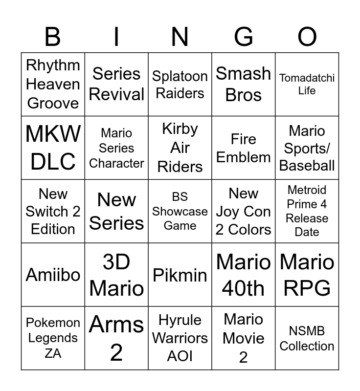 This bingo card has 25 words: 3D Mario, Hyrule Warriors AOI, Kirby Air Riders, Pokemon Legends ZA, Tomadatchi Life, Rhythm Heaven Groove, MKW DLC, Series Revival, New Joy Con 2 Colors, Pikmin, Fire Emblem, New Switch 2 Edition, Mario 40th, Mario RPG, Mario Series Character, NSMB Collection, Metroid Prime 4 Release Date, Splatoon Raiders, Mario Sports/ Baseball, New Series, BS Showcase Game, Arms 2, Amiibo, Smash Bros and Mario Movie 2.