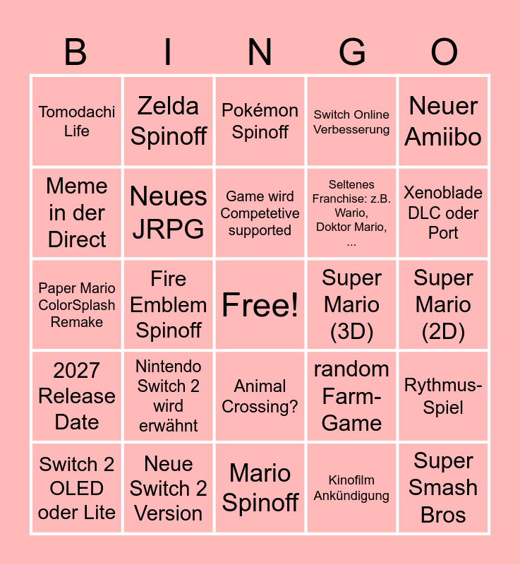 This bingo card has a free space and 24 words: Switch 2 OLED oder Lite, Nintendo Switch 2 wird erwähnt, Game wird Competetive supported, Kinofilm Ankündigung, Neuer Amiibo, Tomodachi Life, Zelda Spinoff, Pokémon Spinoff, Super Mario (3D), Super Mario (2D), Paper Mario ColorSplash Remake, Neues JRPG, random Farm-Game, Rythmus-Spiel, Meme in der Direct, Neue Switch 2 Version, Mario Spinoff, Switch Online Verbesserung, Xenoblade DLC oder Port, 2027 Release Date, Fire Emblem Spinoff, Animal Crossing?, Seltenes Franchise: z.B. Wario, Doktor Mario, ... and Super Smash Bros.