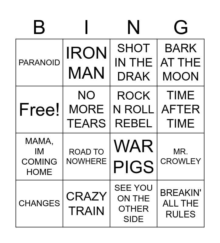This bingo card has 16 words: CRAZY TRAIN, MR. CROWLEY, SHOT IN THE DRAK, PARANOID, MAMA, IM COMING HOME, IRON MAN, WAR PIGS, SEE YOU ON THE OTHER SIDE, Free!, NO MORE TEARS, CHANGES, BARK AT THE MOON, ROAD TO NOWHERE, TIME AFTER TIME, ROCK N ROLL REBEL and BREAKIN' ALL THE RULES.