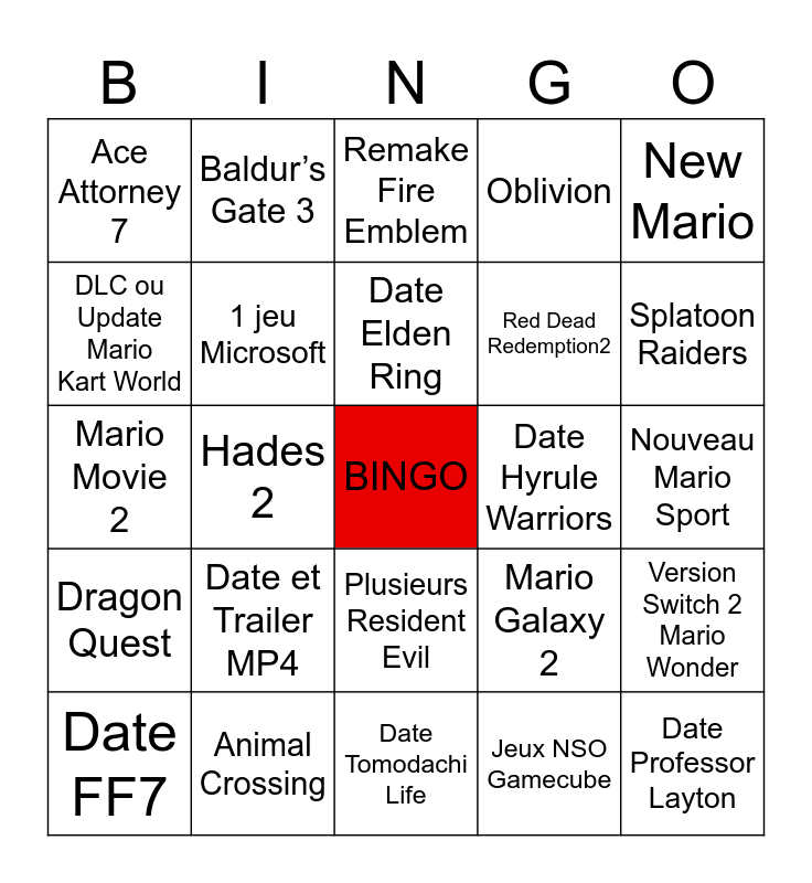 This bingo card has a free space and 24 words: Date et Trailer MP4, Animal Crossing, Date Elden Ring, Date FF7, New Mario, Ace Attorney 7, DLC ou Update Mario Kart World, Baldur’s Gate 3, Date Hyrule Warriors, Plusieurs Resident Evil, Red Dead Redemption2, Mario Movie 2, Mario Galaxy 2, Version Switch 2 Mario Wonder, 1 jeu Microsoft, Jeux NSO Gamecube, Nouveau Mario Sport, Remake Fire Emblem, Splatoon Raiders, Hades 2, Date Professor Layton, Dragon Quest, Oblivion and Date Tomodachi Life.
