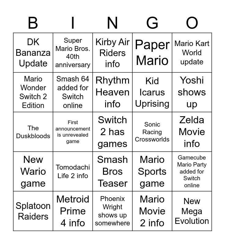 This bingo card has a free space and 24 words: Tomodachi Life 2 info, Metroid Prime 4 info, Rhythm Heaven info, Splatoon Raiders, Mario Kart World update, DK Bananza Update, Mario Wonder Switch 2 Edition, Super Mario Bros. 40th anniversary, Sonic Racing Crossworlds, Smash Bros Teaser, Kid Icarus Uprising, The Duskbloods, Mario Sports game, Gamecube Mario Party added for Switch online, Smash 64 added for Switch online, Mario Movie 2 info, Zelda Movie info, Kirby Air Riders info, Yoshi shows up, First announcement is unrevealed game, New Mega Evolution, New Wario game, Paper Mario and Phoenix Wright shows up somewhere.