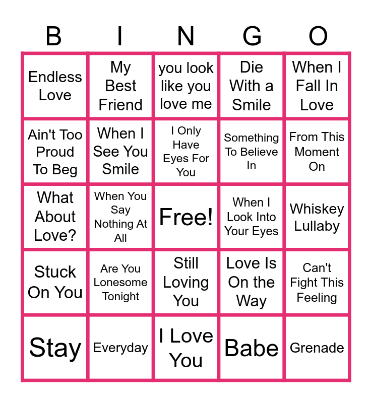 This bingo card has a free space and 24 words: Are You Lonesome Tonight, Everyday, I Only Have Eyes For You, Stay, When I Fall In Love, Endless Love, Ain't Too Proud To Beg, My Best Friend, When I Look Into Your Eyes, Still Loving You, Something To Believe In, What About Love?, Love Is On the Way, Can't Fight This Feeling, When I See You Smile, Babe, Whiskey Lullaby, you look like you love me, From This Moment On, When You Say Nothing At All, Grenade, Stuck On You, Die With a Smile and I Love You.