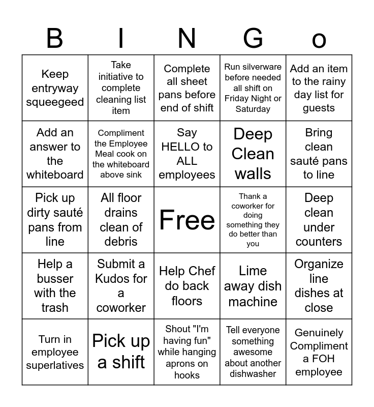 This bingo card has a free space and 24 words: Submit a Kudos for a coworker, Pick up a shift, Say HELLO to ALL employees, Turn in employee superlatives, Add an item to the rainy day list for guests, Keep entryway squeegeed, Add an answer to the whiteboard, Take initiative to complete cleaning list item, Thank a coworker for doing something they do better than you, Help Chef do back floors, Deep Clean walls, Pick up dirty sauté pans from line, Lime away dish machine, Organize line dishes at close, Compliment the Employee Meal cook on the whiteboard above sink, Tell everyone something awesome about another dishwasher, Deep clean under counters, Complete all sheet pans before end of shift, Bring clean sauté pans to line, All floor drains clean of debris, Genuinely Compliment a FOH employee, Help a busser with the trash, Run silverware before needed all shift on Friday Night or Saturday and Shout "I'm having fun" while hanging aprons on hooks.