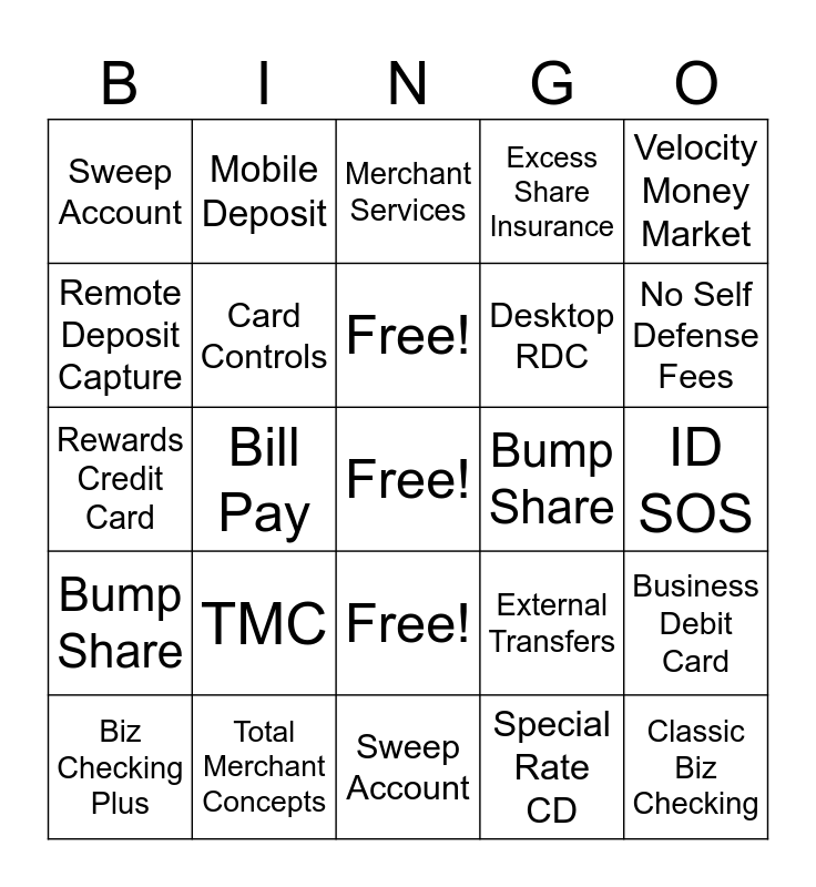 This bingo card has a free space and 24 words: Biz Checking Plus, TMC, Free!, Special Rate CD, Velocity Money Market, Sweep Account, Mobile Deposit, Merchant Services, Bump Share, ID SOS, Rewards Credit Card, Card Controls, External Transfers, Business Debit Card, Remote Deposit Capture, Total Merchant Concepts, Sweep Account, Excess Share Insurance, No Self Defense Fees, Bump Share, Bill Pay, Free!, Desktop RDC and Classic Biz Checking.