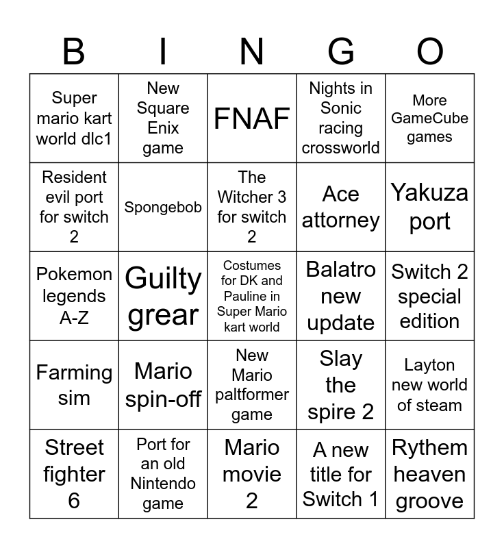 This bingo card has 25 words: Farming sim, Port for an old Nintendo game, Costumes for DK and Pauline in Super Mario kart world, A new title for Switch 1, More GameCube games, Super mario kart world dlc1, New Square Enix game, FNAF, Balatro new update, Layton new world of steam, Resident evil port for switch 2, Spongebob, Mario movie 2, Slay the spire 2, Yakuza port, Street fighter 6, Guilty grear, The Witcher 3 for switch 2, Ace attorney, Switch 2 special edition, Pokemon legends A-Z, Mario spin-off, New Mario paltformer game, Nights in Sonic racing crossworld and Rythem heaven groove.