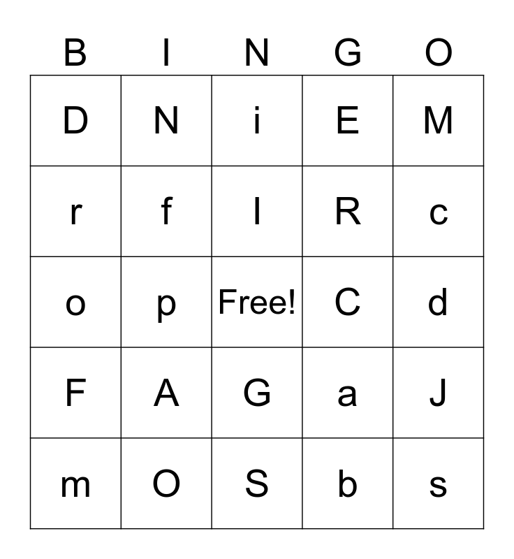 This bingo card has a free space and 34 words: B, b, T, t, F, f, M, m, N, n, I, i, U, u, C, c, O, o, A, a, G, g, D, d, S, s, E, e, R, r, P, p, J and j.