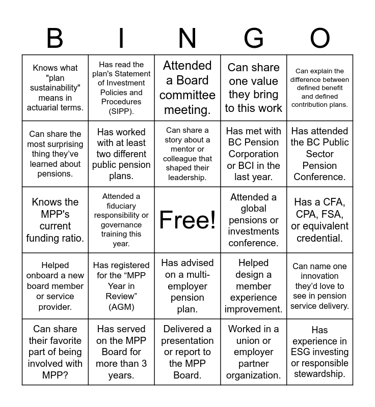 This bingo card has a free space and 30 words: Has served on the MPP Board for more than 3 years., Participated in another strategic planning session., Attended a fiduciary responsibility or governance training this year., Has read the most recent actuarial valuation., Knows what "plan sustainability" means in actuarial terms., Attended a Board committee meeting., Has worked with at least two different public pension plans., Has advised on a multi-employer pension plan., Attended a global pensions or investments conference., Delivered a presentation or report to the MPP Board., Has a CFA, CPA, FSA, or equivalent credential., Has experience in ESG investing or responsible stewardship., Worked in a union or employer partner organization., Has co-authored or reviewed a briefing note., Has attended the BC Public Sector Pension Conference., Has taken part in a member outreach or engagement session., Helped design a member experience improvement., Helped onboard a new board member or service provider., Has registered for the “MPP Year in Review” (AGM), Can explain the difference between defined benefit and defined contribution plans., Knows the MPP's current funding ratio., Knows which asset classes make up the MPP investment portfolio., Has read the plan's Statement of Investment Policies and Procedures (SIPP)., Has met with BC Pension Corporation or BCI in the last year., Can share the most surprising thing they’ve learned about pensions., Can share one value they bring to this work, Can name one innovation they’d love to see in pension service delivery., Can share their favorite part of being involved with MPP?, Can share a story about a mentor or colleague that shaped their leadership. and Has completed all components of the MPP educational journey..