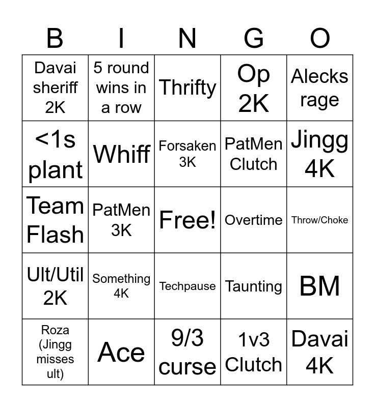 This bingo card has a free space and 24 words: Something 4K, Ace, Forsaken 3K, Roza (Jingg misses ult), Alecks rage, Davai sheriff 2K, <1s plant, 5 round wins in a row, Overtime, Techpause, PatMen Clutch, Team Flash, Taunting, BM, Whiff, 1v3 Clutch, Throw/Choke, Thrifty, Jingg 4K, PatMen 3K, Davai 4K, Ult/Util 2K, Op 2K and 9/3 curse.