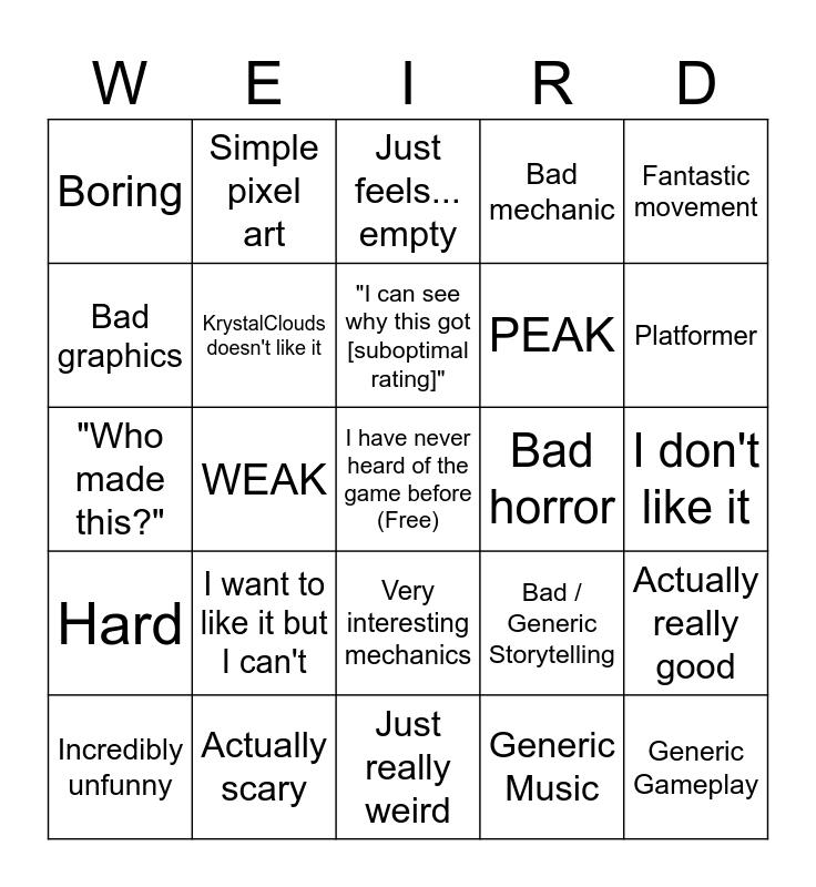 This bingo card has a free space and 27 words: Bad / Generic Storytelling, God-awful, PEAK, Just really weird, Bad graphics, Just feels... empty, Simple pixel art, Hard, Bad horror, Actually really good, "Who made this?", Bad mechanic, Incredibly unfunny, Actually scary, Platformer, Ungodly Easy, KrystalClouds doesn't like it, "I can see why this got [suboptimal rating]", I want to like it but I can't, Boring, I don't like it, Generic Music, WEAK, Generic Gameplay, Very interesting mechanics, Fantastic movement and Bad level design.