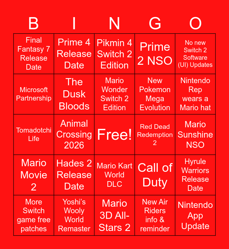 This bingo card has a free space and 24 words: Hades 2 Release Date, Yoshi’s Wooly World Remaster, Mario Wonder Switch 2 Edition, More Switch game free patches, No new Switch 2 Software (UI) Updates, Final Fantasy 7 Release Date, Microsoft Partnership, Prime 4 Release Date, Red Dead Redemption 2, Mario Kart World DLC, New Pokemon Mega Evolution, Tomadotchi Life, Call of Duty, Hyrule Warriors Release Date, The Dusk Bloods, New Air Riders info & reminder, Mario Sunshine NSO, Pikmin 4 Switch 2 Edition, Nintendo Rep wears a Mario hat, Animal Crossing 2026, Nintendo App Update, Mario Movie 2, Prime 2 NSO and Mario 3D All-Stars 2.