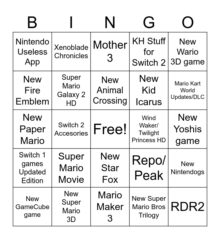 This bingo card has a free space and 24 words: Super Mario Movie, New Super Mario 3D, New Animal Crossing, New GameCube game, New Wario 3D game, Nintendo Useless App, New Fire Emblem, Xenoblade Chronicles, Wind Waker/ Twilight Princess HD, New Star Fox, New Kid Icarus, New Paper Mario, Repo/ Peak, New Nintendogs, Super Mario Galaxy 2 HD, New Super Mario Bros Trilogy, New Yoshis game, Mother 3, Mario Kart World Updates/DLC, Switch 2 Accesories, RDR2, Switch 1 games Updated Edition, KH Stuff for Switch 2 and Mario Maker 3.