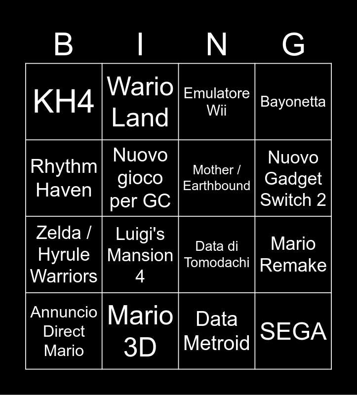 This bingo card has 16 words: Mario 3D, Mario Remake, Emulatore Wii, KH4, Zelda / Hyrule Warriors, Wario Land, Data di Tomodachi, Data Metroid, Rhythm Haven, Nuovo gioco per GC, Annuncio Direct Mario, Bayonetta, Luigi's Mansion 4, Nuovo Gadget Switch 2, Mother / Earthbound and SEGA.