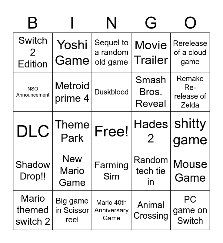 This bingo card has a free space and 24 words: New Mario Game, Big game in Scissor reel, Duskblood, Mario themed switch 2, Rerelease of a cloud game, Switch 2 Edition, NSO Announcement, Yoshi Game, Hades 2, Farming Sim, Smash Bros. Reveal, DLC, Random tech tie in, Mouse Game, Metroid prime 4, Animal Crossing, shitty game, Sequel to a random old game, Remake Re-release of Zelda, Theme Park, PC game on Switch, Shadow Drop!!, Movie Trailer and Mario 40th Anniversary Game.