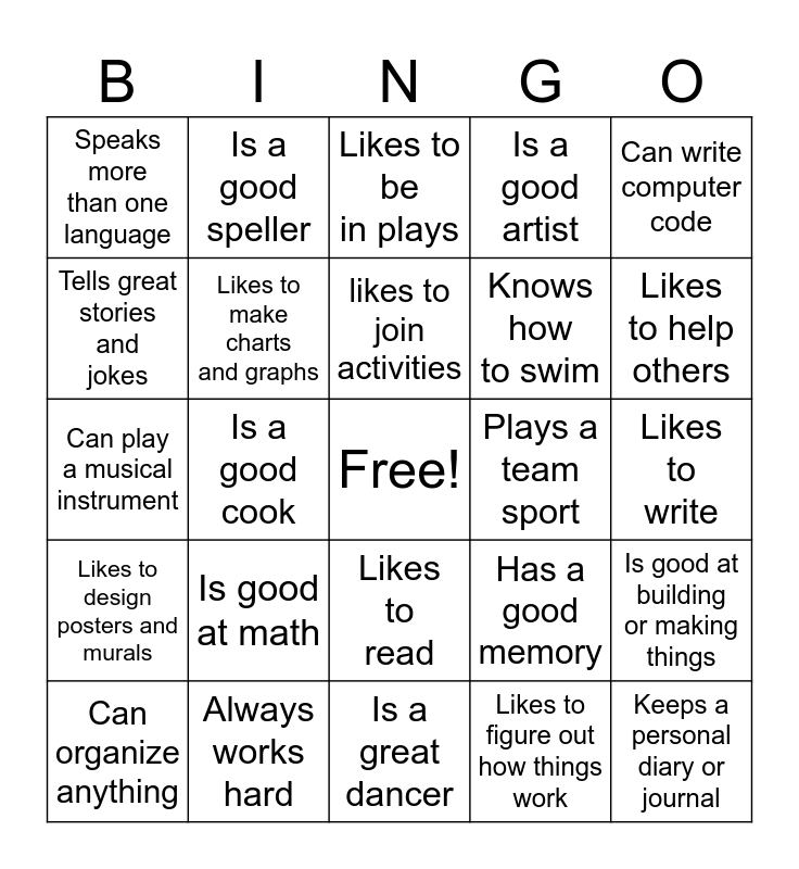 This bingo card has a free space and 24 words: Is good at math, Always works hard, likes to join activities, Can organize anything, Can write computer code, Speaks more than one language, Tells great stories and jokes, Is a good speller, Plays a team sport, Likes to read, Knows how to swim, Can play a musical instrument, Has a good memory, Is good at building or making things, Likes to make charts and graphs, Likes to figure out how things work, Likes to write, Likes to be in plays, Likes to help others, Is a good cook, Keeps a personal diary or journal, Likes to design posters and murals, Is a good artist and Is a great dancer.