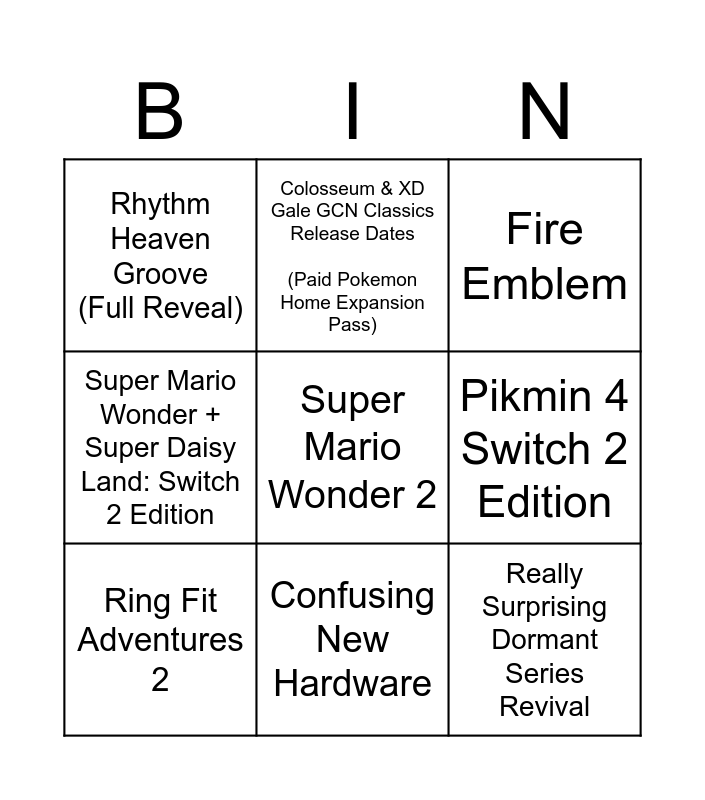 This bingo card has a free space and 8 words: Pikmin 4 Switch 2 Edition, Fire Emblem, Colosseum & XD Gale GCN Classics Release Dates (Paid Pokemon Home Expansion Pass), Ring Fit Adventures 2, Rhythm Heaven Groove (Full Reveal), Really Surprising Dormant Series Revival, Super Mario Wonder + Super Daisy Land: Switch 2 Edition and Confusing New Hardware.