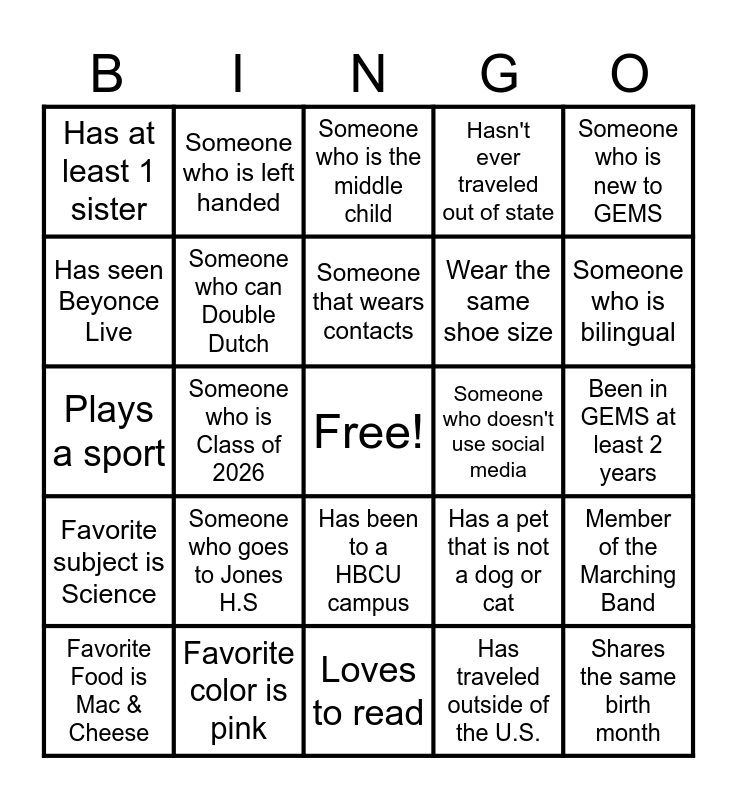 This bingo card has a free space and 24 words: Someone who goes to Jones H.S, Favorite color is pink, Someone that wears contacts, Favorite Food is Mac & Cheese, Someone who is new to GEMS, Has at least 1 sister, Has seen Beyonce Live, Someone who is left handed, Someone who doesn't use social media, Has been to a HBCU campus, Wear the same shoe size, Plays a sport, Has a pet that is not a dog or cat, Member of the Marching Band, Someone who can Double Dutch, Has traveled outside of the U.S., Been in GEMS at least 2 years, Someone who is the middle child, Someone who is bilingual, Someone who is Class of 2026, Shares the same birth month, Favorite subject is Science, Hasn't ever traveled out of state and Loves to read.