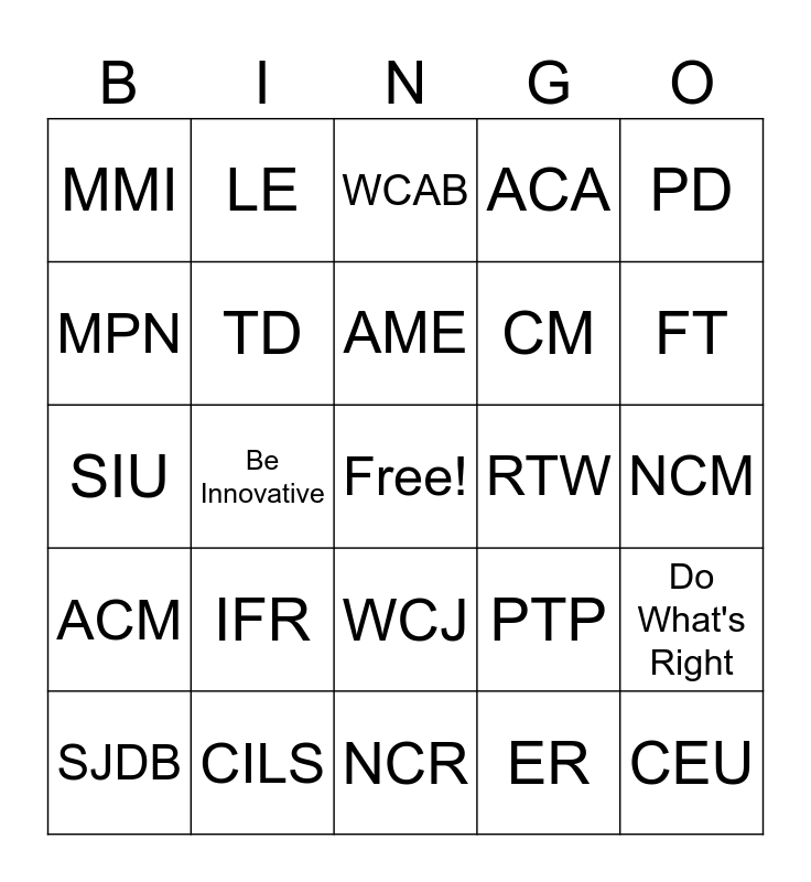 This bingo card has a free space and 34 words: EE, ER, IW, AA, ACM, TD, PD, SJDB, LE, QME, AME, WCAB, C&R, CIS, RTW, FT, CILS, SIU, IFR, PTP, WCJ, DOK, MMI, NCM, NCR, CEU, ACA, MCO, CM, MPN, Show We Care, Be Innovative, Do What's Right and Respect Everyone.