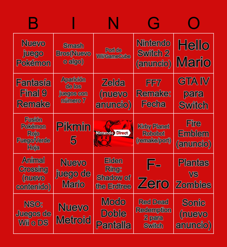 This bingo card has a free space and 24 words: Nuevo juego de Mario, Nuevo Metroid, Zelda (nuevo anuncio), NSO: Juegos de Wii o DS, Hello Mario, Nuevo juego Pokémon, Fantasía Final 9 Remake, Smash Bros(Nuevo o algo), Kirby Planet Robobot (remake/port), Elden Ring: Shadow of the Erdtree, FF7 Remake: Fecha, Fusión Pokémon Rojo Fuego/Verde Hoja, F-Zero, Plantas vs Zombies, Aparición de los juegos con número 7, Red Dead Redemption 2 para Switch, Fire Emblem (anuncio), Port de Wii/GameCube, GTA IV para Switch, Pikmin 5, Sonic (nuevo anuncio), Animal Crossing (nuevo contenido), Nintendo Switch 2 (anuncio) and Modo Doble Pantalla.