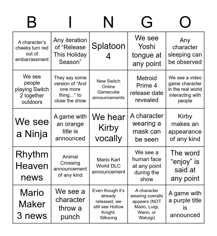 This bingo card has 25 words: Animal Crossing announcement of any kind, Even though it’s already released, we still see Hollow Knight: Silksong, New Switch Online Gamecube announcements, Mario Maker 3 news, Any character sleeping can be observed, A character’s cheeks turn red out of embarrassment, We see people playing Switch 2 together outdoors, Any iteration of “Release This Holiday Season”, A character wearing a mask can be seen, Mario Kart World DLC announcement, Metroid Prime 4 release date revealed, We see a Ninja, We see a human face at any point during the show, The word “enjoy” is said at any point, They say some version of “And one more thing…” to close the show, A game with a purple title is announced, Kirby makes an appearance of any kind, Splatoon 4, We see a video game character in the real world interacting with people, A game with an orange title is announced, We hear Kirby vocally, We see a character throw a punch, Rhythm Heaven news, We see Yoshi tongue at any point and A character wearing overalls appears (NOT Mario, Luigi, Wario, or Waluigi).