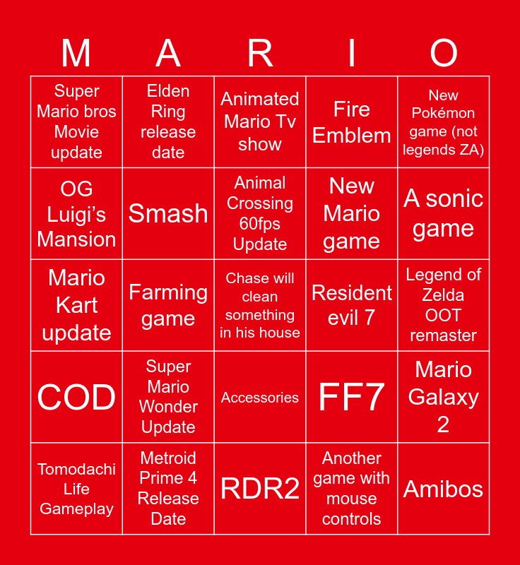 This bingo card has a free space and 24 words: Super Mario Wonder Update, Metroid Prime 4 Release Date, Animal Crossing 60fps Update, Tomodachi Life Gameplay, New Pokémon game (not legends ZA), Super Mario bros Movie update, OG Luigi’s Mansion, Elden Ring release date, Resident evil 7, Accessories, New Mario game, Mario Kart update, FF7, Mario Galaxy 2, Smash, Another game with mouse controls, Legend of Zelda OOT remaster, Animated Mario Tv show, A sonic game, Farming game, Amibos, COD, Fire Emblem and RDR2.