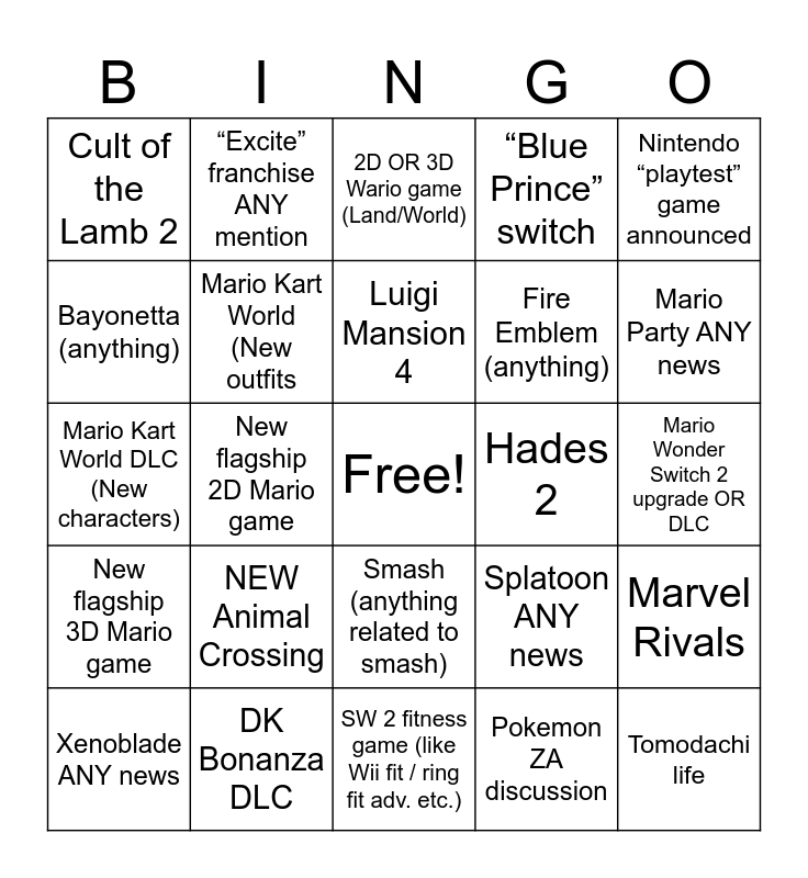 This bingo card has a free space and 40 words: More details on Kirby Air Ride, Mario Kart World DLC (New characters), Mario Kart World DLC (New Maps), Mario Kart World (New outfits, DK Bonanza DLC, Smash (anything related to smash), Luigi Mansion 4, Mario Galaxy 2 on switch, Nintendo “playtest” game announced, New flagship 3D Mario game, New flagship 2D Mario game, “Blue Prince” switch, Tomodachi life, Mario Wonder Switch 2 upgrade OR DLC, Hades 2, NEW Animal Crossing, Pikmin 4 Switch 2 upgrade, Cult of the Lamb 2, Metroid Prime 4 Release Date, 2D OR 3D Wario game (Land/World), Marvel Rivals, Pokemon ZA discussion, Fire Emblem (anything), Bayonetta (anything), Mario Sports game (ANY, ex strikers, golf), Mario Maker (any news), Final Fantasy (any news), Animal Crossing New Horizon SW2 edition, Hyrule Warriors ANY news, Mario Sunshine on GC NSO, NEW Pikmin game (ex, 5 or spinoff), Xenoblade ANY news, Pokémon Colosseum GC NSO, Splatoon ANY news, Mario Party ANY news, SW 2 fitness game (like Wii fit / ring fit adv. etc.), Captain Toad ANY news, Paper Mario ANY news, “Excite” franchise ANY mention and Rhythm Heaven release date (specific, not month).