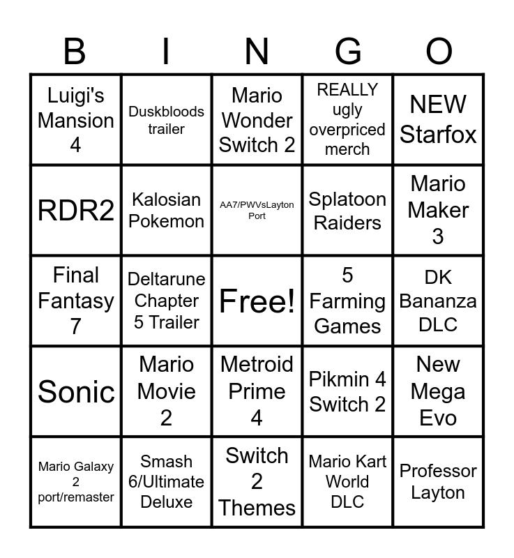 This bingo card has a free space and 24 words: Mario Movie 2, Smash 6/Ultimate Deluxe, AA7/PWVsLayton Port, Mario Galaxy 2 port/remaster, NEW Starfox, Luigi's Mansion 4, RDR2, Duskbloods trailer, 5 Farming Games, Metroid Prime 4, Splatoon Raiders, Final Fantasy 7, Pikmin 4 Switch 2, New Mega Evo, Kalosian Pokemon, Mario Kart World DLC, DK Bananza DLC, Mario Wonder Switch 2, Mario Maker 3, Deltarune Chapter 5 Trailer, Professor Layton, Sonic, REALLY ugly overpriced merch and Switch 2 Themes.