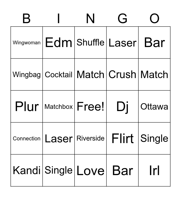 This bingo card has a free space and 24 words: Laser, Single, Match, Kandi, Bar, Wingwoman, Wingbag, Edm, Dj, Riverside, Crush, Plur, Flirt, Single, Cocktail, Bar, Ottawa, Shuffle, Match, Matchbox, Irl, Connection, Laser and Love.